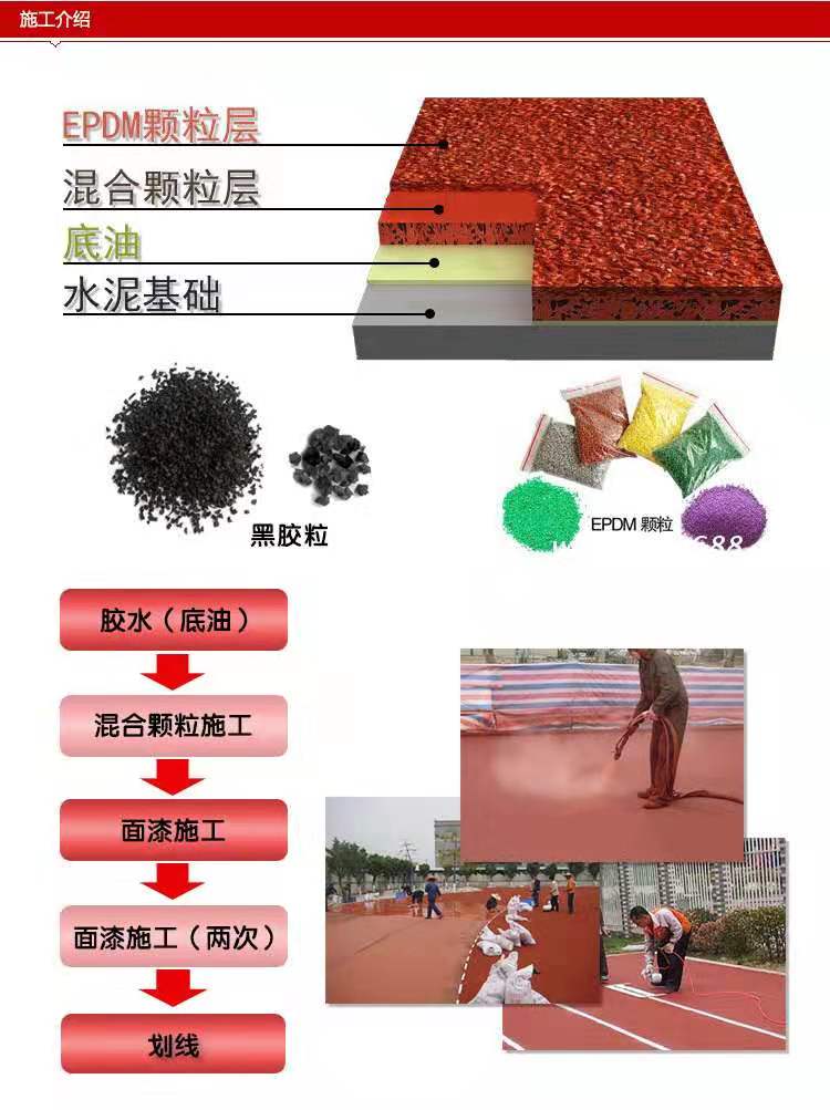 4、將所需材料(橡膠顆粒、EPDM彩色顆粒、聚氨酯膠水、聚氨酯噴面膠(甲、乙組)、分散性輔助劑)及機具全部有序擺放于施工地點。