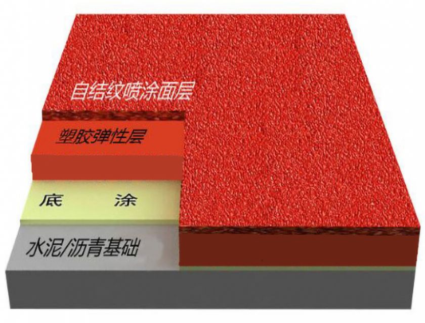 自結(jié)紋塑膠跑道面層:標(biāo)準(zhǔn)13mm,塑膠采用三層復(fù)合結(jié)構(gòu),其表面為無(wú)固態(tài)EPDM顆粒的自結(jié)紋路(非印花型),面層厚度2mm厚聚氨酯膠漿混合攪拌噴涂后發(fā)生化學(xué)反應(yīng)自然形成無(wú)顆粒防滑層紋路,來(lái)達(dá)到一定的摩察系數(shù),滿足防濕滑等指標(biāo),具有顏色鮮艷,耐老化,耐磨損,防滑等特點(diǎn)。